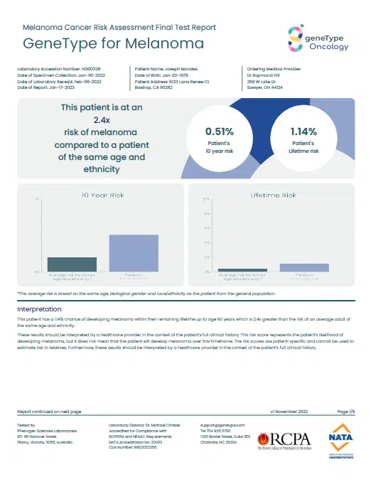 Determine your personal likelihood of developing melanoma over the next 5 years & lifetime with a combined clinical & genetic risk assessment test derived from up to 200 genetic markers, including all racial variables for disease.
